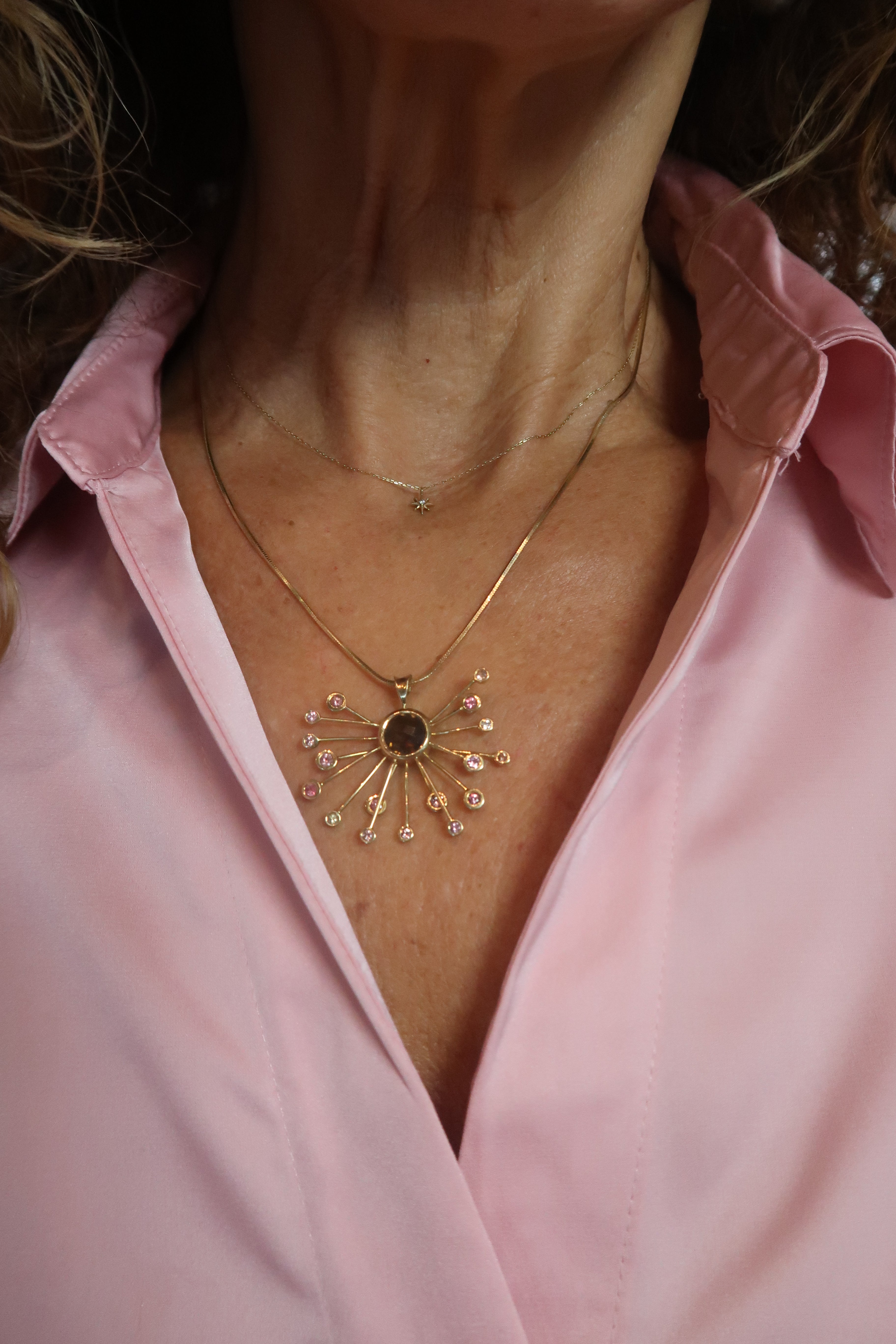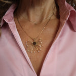 Golden Sun Burst Pendant with Sapphire and Smokey Quartz